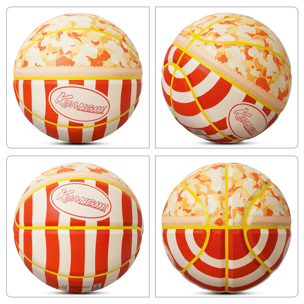Kuangmi Popcorn Basketball (Size 7, 29.5") features a playful popcorn-in-container design—complete with fluffy popcorn textures and classic red-white striped packaging details. Made of durable Hygroscopic PU leather, it delivers excellent grip and long-lasting wear-resistance. Its deep channel design boosts control for dunks, throws, and passes, suiting youth and casual players. It performs well for both indoor and outdoor use on surfaces like wooden floors, rubber floors, and concrete courts.
